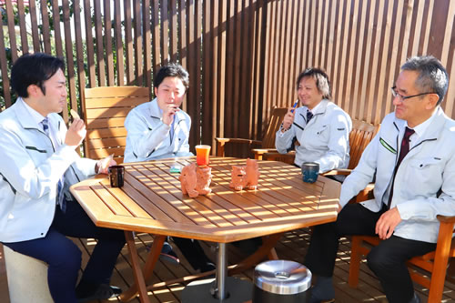 喫煙する社員同士で談笑しながら1st SMOKING TIME。